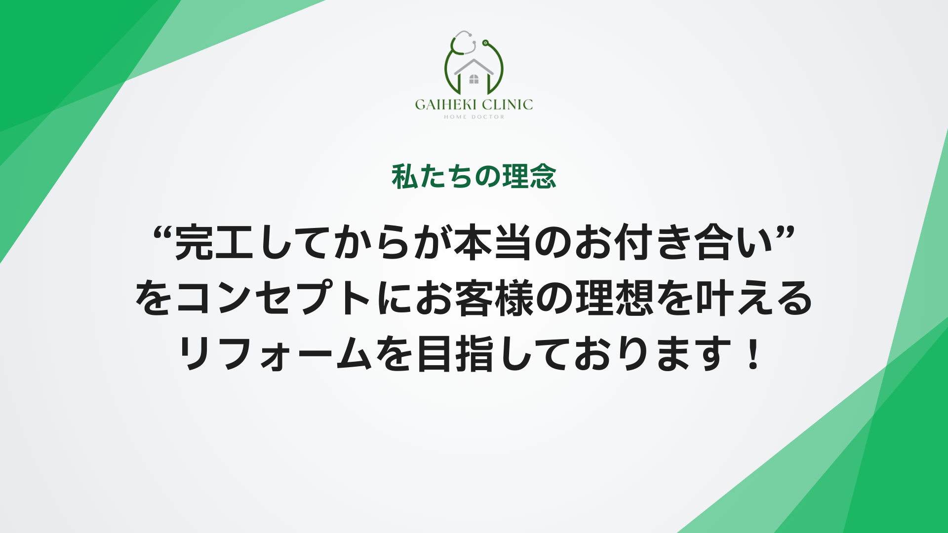 ガイヘキクリニックが掲げる【お客様にとって”本当に必要な工事”しかご提案しない。】を大切にしたサービスを日々心がけております。
